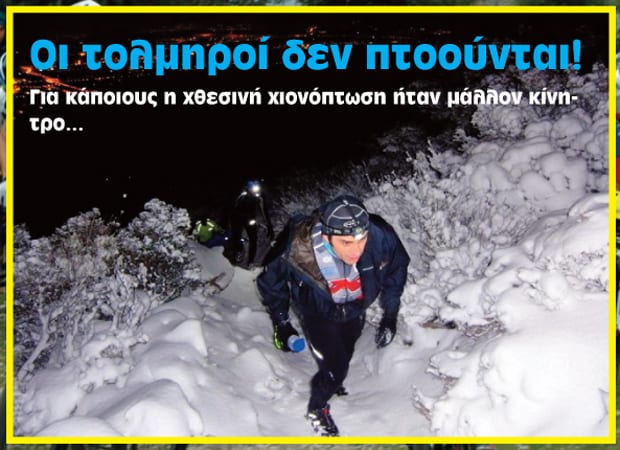 Ομάδα τολμηρών αθλητών αψήφησε τις άσχημες καιρικές συνθήκες και πραγματοποίησε νυχτερινή εξόρμηση για πεζοπορία/ τρέξιμο στον Υμηττό. Το κρύο και το χιόνι όχι μόνο δεν αποθάρρυνε τους αθλητές αλλά μάλλον αποτέλεσε ένα επιπλέον κίνητρο για μία ξεχωριστή βόλτα στο βουνό. Το τοπίο δεν θύμιζε σε τίποτα το συνηθισμένο σκηνικό και η ομάδα είχε την ευκαιρία να απολαύσει μία σπάνια διαδρομή μέσα στο χιονισμένο τοπίο.
