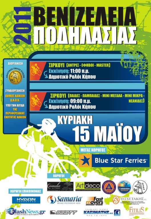 Ο Α.Ο. «ΚΥΔΩΝ» Χανίων και ο Π.Ο. «ΤΑΛΩΣ» στις 13-14-15 Μαϊου 2011 διοργανώνουν τα «ΒΕΝΙΖΕΛΕΙΑ 2011» και «ΜΑΧΗ ΚΡΗΤΗΣ» αγώνες ποδηλασίας, με τους πιο κάτω ειδικούς όρους: