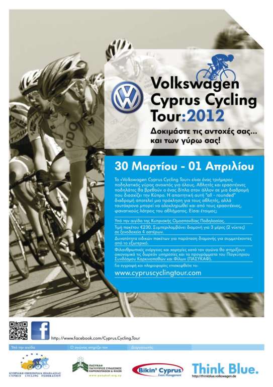 Το Volkswagen Cyprus Cycling Tour 2012 είναι αγώνας Δρόμου ανοικτός σε όλους, διάρκειας τριών ημερών ο οποίος θα διεξαχθεί στην Κύπρο από τις 30 Μαρτίου μέχρι της 1η Απριλίου 2012. Είναι μία διοργάνωση όπου επαγγελματίες και ερασιτέχνες ποδηλάτες έχουν την ευκαιρία να ποδηλατήσουν πλάι -πλάι, να ανέβουν τα ομορφότερα βουνά της Κύπρου και θα απολαύσουν το κλίμα και τη φύση της Κύπρου